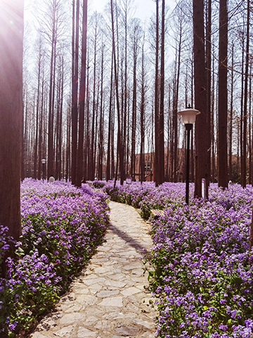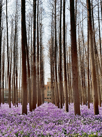 還有一次震撼也是毫無預兆的,那是我去南京看望在南京理工大學南京校區讀書的孫子,位於孝陵衛200號,只要登記就可以進,竟然發現那裡成片的二月蘭也開了。水杉林和二月蘭相映成趣,一大片紫色花海,同樣讓我震驚,