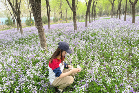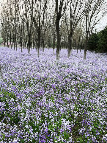 有人說苦,但我覺得不苦。老閨蜜和我一起找嫩的部分吃,如果掐不動的部分就扔掉。我說,這麼美的花能留它們一條生路嗎?回想村裡人帶著我們在黑山寨棧道底下,和零星的水邊採摘,挺辛苦的。我在北京市馬駒橋鎮京津塘高速與漷馬路交匯處東北側的通州區馬駒橋濕地公園,也看過二月蘭。春天這裡好像變成仙境,花跟瘋了似的氾濫,據說是水土環境造成的,原圖手機拍就很美。這裡的濕地公園規模太大了,我隨處走都是二月蘭的海洋,而且沒人管,有種森林的感覺,想像自己成為精靈。這裡人煙稀少,適合跑步,林下灌木下光照程度不同,使得二月蘭的深度和顏色也不一樣,每一片二月蘭都是獨一無二的,深紫淺紫純白紫紅粉紅……色調浪漫到讓年輕女孩驚呼,缺點就是只有在北京通州春天限定開放。