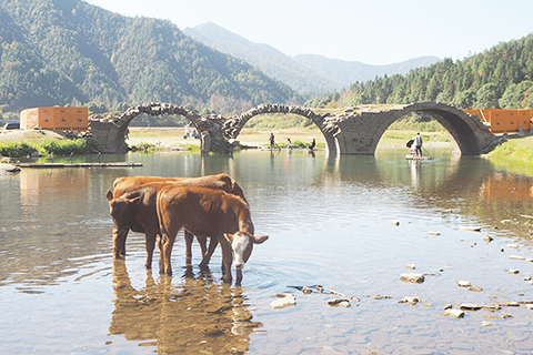 ◎ 十一月十一日,初冬時節,航拍位於江西省上饒市婺源縣段莘鄉的「三眼橋」。該橋建於清代嘉慶十三年(公元一八零八年),正名永濟橋,是一座三拱石橋,俗稱「三眼橋」。古橋下水流潺潺,橋的三拱倒映水中,遠望似三隻明眸。圖為一群牛在婺源縣「三眼橋」旁的溪流中飲水休憩。(中新社記者 劉佔昆 攝)