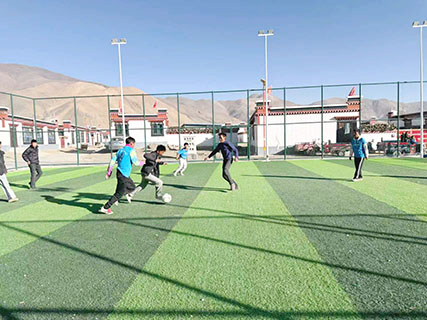 海拔4100米的森嘎村,綠茵場上足球比賽正酣。村廣場上,老人曬著太陽,小孩們騎著自行車在路上追逐嬉戲打鬧,流動百貨車吸引人們圍觀,寬敞帶院的藏式新房座落有序。眼前景象,已不見地震「傷痕」。