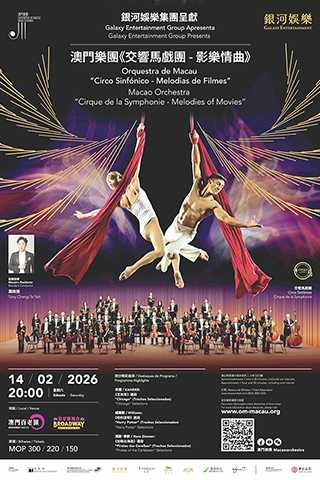 由文化局、澳門樂團有限公司及銀河娛樂集團攜手呈獻的澳門樂團《交響馬戲團—影樂情曲》,將於2月14日(周六)晚上8時在「澳門百老匯」之「百老匯舞台」上演,澳門樂團將聯手馬戲團Cirque de la Symphonie,為樂迷帶來一場集交響樂與馬戲及雜耍於一身的精彩演出。