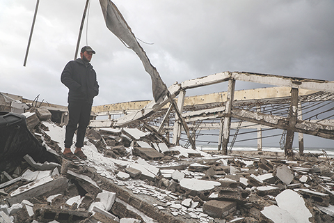 ◎ 巴勒斯坦加沙地帶衛生部門一月十三日發表聲明說,冬季的嚴寒強風天氣在過去二十四小時內造成加沙地帶四人死亡,其中一名一歲嬰兒死於寒冷天氣,另有三人死於狂風導致的建築倒塌。圖為當日,一名巴勒斯坦人在加沙城檢查遭強風天氣損毀的建築。(新華社發 里澤克.阿卜杜勒賈瓦德 攝)