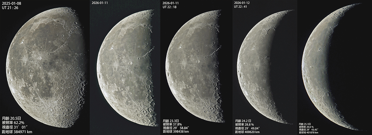 難得一踏入二零二六年的天色持續晴朗,才可以拍到下弦月後的連續月相變化過程。然而由於月相是出現在日出前,所以,要大清早的日出前拍攝,由於這段日子剛好是寒流襲澳,要頂著寒風拍攝,這些影像得來不易呢。