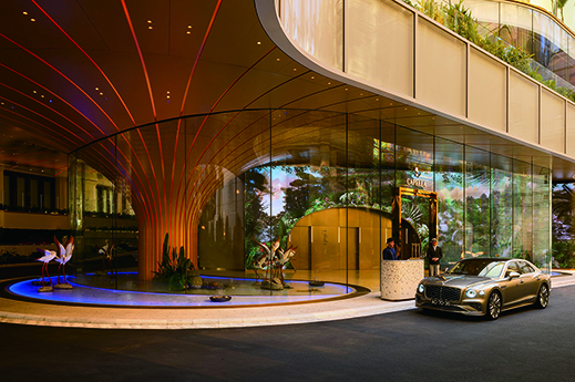 柔和的弧線、圓潤的邊緣,以及如熱帶雨林樹冠間灑落般的斑駁光影,自車道入口起便引領賓客的體驗。半戶外而低調的車道入口絲滑地將澳門躍動的城市節奏轉化為靜謐氛圍,配合周邊繁盛的綠葉營造出私密與安寧之感。踏入大堂,隨即映入眼眸的便是由光與潺潺流水構築的空間,框景著象徵生命律動的「生命之樹」──大堂的核心──以流動色彩脈動生輝。