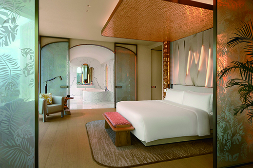 尊尚兩房式及尊尚套房由128平方米起,設有室內私人泳池、日光浴床、鋪滿馬賽克地板的綠色天河石大理石浴室。睡房以人手繪製LaLa Curio的叢林風格牆飾點綴,並延伸至如樹冠般的天花上。