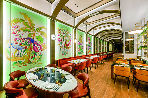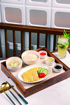 澳門美高梅的「話匣子」,室內設計靈感源自新加坡本店,並融入澳門獨特的葡式建築元素,透過拱形門廊、木飾細節及馬賽克嵌畫等,營造東南亞與南歐文化交融的當代氛圍。餐廳請來自新加坡的藝術家陳紫曦創作四幅主題畫作,以藝術語言詮釋「話匣子」四大經典美饌,包括「新加坡文華雞飯」、「龍蝦喇沙」、「新加坡咖喱雞」及「招牌椰子雪糕」,當中加入澳門生態意象如蓮花與黑臉琵鷺,打造新加坡風味與澳門相互交織的獨特風景。