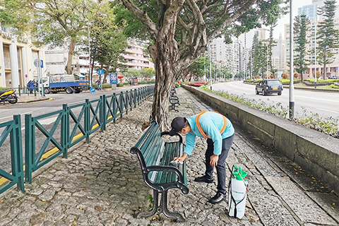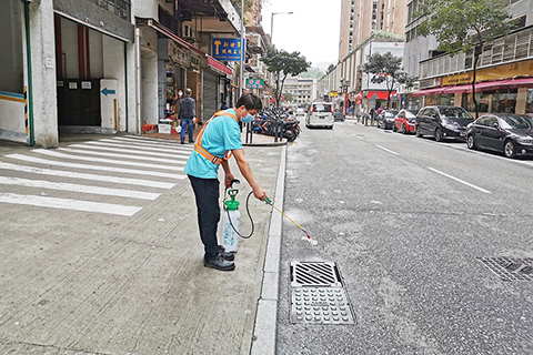 為減低病毒在社區傳播的風險,市政署在環境衛生工作上採取多項措施,包括持續協調澳門清潔專營有限公司以稀釋漂白水清洗本澳各出入境口岸、巴士站、的士站、公共街道、廣場及小販區等;此外,安排清潔服務公司以專用噴霧器,將經稀釋的漂白水噴灑於渠道口、行人道欄杆,以及清抹行人天橋扶手梯、巴士站候車亭、遮雨棚、椅子及乘車信息牌等設施,以確保市民大眾在使用相關公共設施時得到安全及衛生的保障,盡量減低病毒傳播的風險。