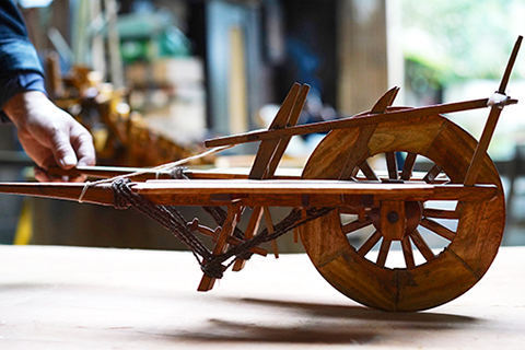 今年七十五歲的郭西燦家住江西省萬載縣康樂街道北門社區,從事木工手藝已有五十多年。多年來,他憑著自己的記憶,不斷重新設計繪畫圖紙,利用木材製作傳統農具模型。如今已製作出農具模型百餘件。這些「迷你」農具在郭西燦的精心雕刻和製作下,讓人們再次體驗到昔日的農耕風情,感受到古老的農耕文化。