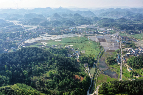 ◎ 群山之中的花茂村環境優美(本月十四日攝,無人機照片)。(新華社記者劉續 攝)
