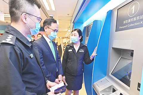 ◎ 香港入境事務處十月二十九日宣佈,為進一步提升服務水平,入境處將於今(三十)日分階段推出「領取護照服務站」,合資格申請人在填寫特區護照申請書時,除現有的領取方式外,可選擇于首階段設置在入境處總部或西九龍辦事處的「領取護照服務站」以自助形式領取特區護照。當領證時,申請人在「領取護照服務站」只需以香港永久性居民身份證及其指模確認身份,便可領取新護照。圖為香港特區政府公務員事務局局長聶德權(中)當天到訪入境事務處,聆聽同事介紹「領取護照服務站」的使用方法。(香港中新社)