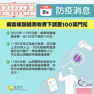 新型冠狀病毒感染應變協調中心昨下午舉行例行記者會,仁伯爵綜合醫院醫務主任羅奕龍公佈,特區政府經與國檢、鏡湖醫院與科大醫院協調後,決定自本月五日起下調病毒核酸檢測收費,在北安客運碼頭、澳門綜藝館、鏡湖醫院和科大醫院四個常規病毒核酸檢測站的檢測收費,將由每次一百二十澳門元下調至一百元。