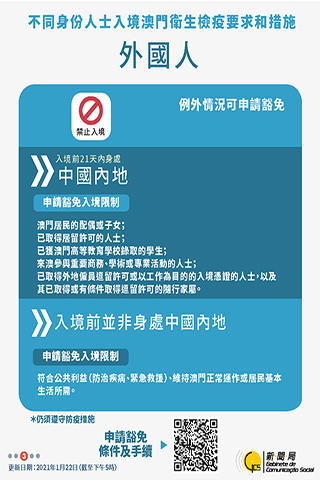 【特訊】新型冠狀病毒感染應變協調中心宣佈,因應黑龍江省的最新疫情發展,衛生局根據第二/二00四號法律《傳染病防治法》第十四條的規定,自本月廿三日十二時起,所有在入境前十四天內曾經到過黑龍江省哈爾濱市的道里區、利民開發區或呼蘭區的人士,須按照衛生當局的要求在指定地點接受十四天醫學觀察以及最少十四天自我健康管理,違反者除可能依法承擔相應的刑事責任外,尚可被採取強制隔離的措施。