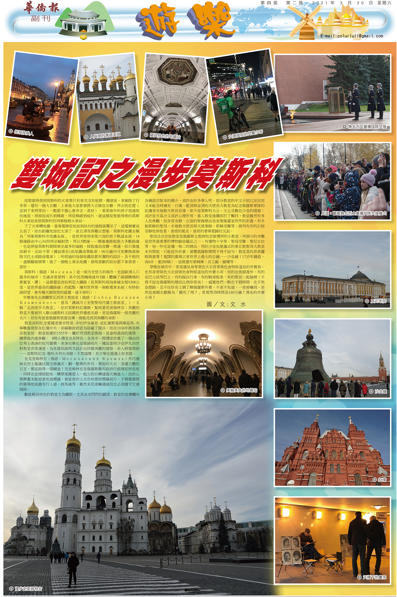 數座極具特色的教堂尤為耀眼,尤其金光閃閃的圓頂,教堂的宣傳欄有各種語言版本的簡介,或許由於多華人吧,部分教堂的中文介紹已派完而又未能及時補充。白墻、藍頂與金頂的天使長大教堂為紀念俄羅斯軍隊的庇護者米迦勒天使長而建,如今是莫斯科大公、王公及數位沙皇的陵寢;或許是天氣冷又或許心理作用,進入教堂後隨即打了顫抖,教堂雖然有多人在參觀,但非常安靜,正面的聖像壁由皇家聖像畫家所作的彩畫,有手抱耶穌的聖母、米迦勒天使長與天使事跡、耶穌受難等;排列有序的石棺安靜地停放著,曾經的風光、曾經的奢華都歸於沉寂。