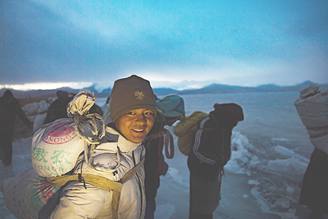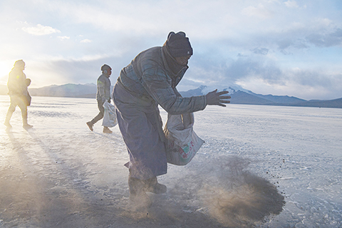 她們要完成一件重要的事情──用牛糞爐灰為羊群在冰湖上「畫」出一條安全的路。這條灰色的小徑總長三公里左右,從湖岸到湖心島。卓瑪和村裡的主婦們熟練地完成。