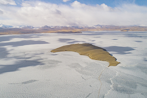 牧羊人扎西引導頭羊來到湖邊。他抱起一隻小羊,向冰面踏出第一步,隨即羊群緩慢跟進。五百多米的羊群長龍,開始離開水草豐美的小島。