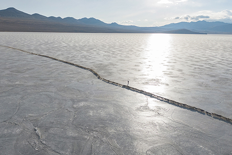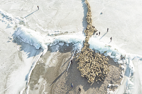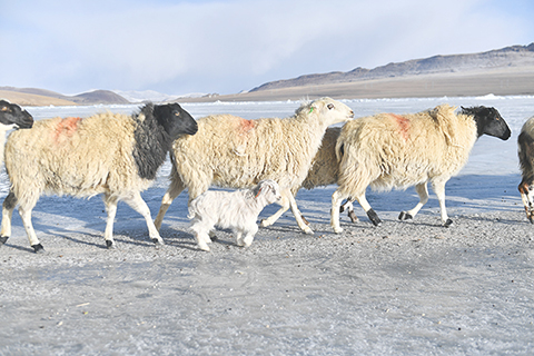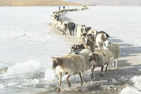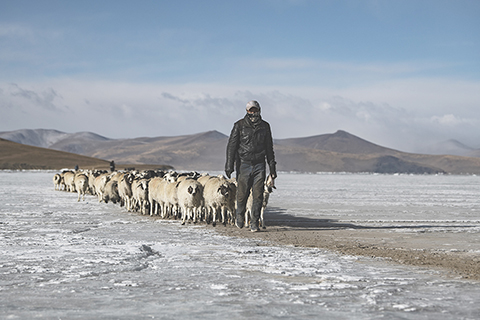 牧羊人趕著羊群,太陽趕著牧羊人。不停向前的羊群在冰湖上拉出長長的隊形。