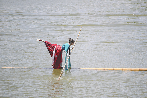 ◎ 獨竹漂是發源於赤水河流域的一項獨特黔北民間絕技。如今,「赤水獨竹漂」被列入國家級非遺代表性項目名錄,已成為一種運動項目及表演方式。今年二十四歲的楊柳是貴州省遵義市的「赤水獨竹漂」非遺傳承人,受到家中長輩的影響,楊柳從七歲開始練習獨竹漂,至今已有十七年。隨著年齡的不斷增長,有舞蹈基礎的楊柳基於傳統的獨竹漂技巧開始不斷創新,將舞蹈和獨竹漂融合在一起,為了提高觀賞性,她還將戲曲等元素融入表演,得到了觀眾的好評和認可,楊柳也成為當地小有名氣的水上表演者。如今,楊柳還在不斷思考、創新,她希望有更多年輕人了解和喜愛獨竹漂技藝。圖為六月四日,楊柳在貴州省遵義市新蒲新區濕地公園展示獨竹漂高難度動作。(中新社)
