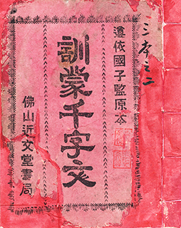 啟蒙讀本,除《訓蒙三字經》外,歷朝國子監認可的還有《訓蒙千字文》及《訓蒙幼學詩》,該些書籍均使用紅色封面,故民間也俗稱其為「紅皮千字文」及「紅皮幼學詩」(見附圖一及二)。據載,千字文原典出於南北朝,梁武帝時,命人拓印王羲之等名家書法中一千個單字,並囑咐王子們臨摹學習;惜單字雜亂無章,後得當朝文職官吏周興嗣整理(1),以四字一句,編著成千字長文:「天地玄黃,宇宙洪荒。日月盈昃,辰宿列張……孤陋寡聞,愚蒙等誚。謂語助者,焉哉乎也。」(2)千字文詞藻華麗,氣勢磅礡,不但句句押韻,讓小孩朗朗上口,而且引經據典傳授儒道學說及自然常識,其文字機巧,充滿古人的哲學智慧;尾段的恭敬謙卑,表現出傳統文人的修養和謙恭精神。千字文作為漢字的初級讀本,千餘年前已相繼傳播至日本、朝鮮、越南等地,並形成所謂的「漢字文化圈」(3)。此外,其用字不重複的特點,從古至今常被借用作編碼,如:古代貢院號舍的命名和試卷編號,近代軍事部隊的番號和地標名稱,以及當代博彩娛樂業的白鴿票等。