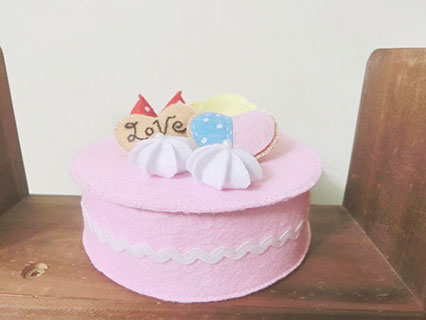 (十四)用珠針將兩塊蛋糕邊布以布面對布面的方式重疊,在適合位置上以平針的方法縫合成圓盒的形狀,再將多出來的布邊剪去,盒內黏上咭紙。