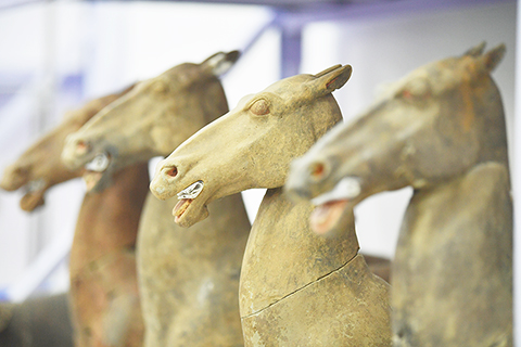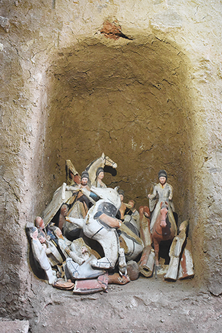 ◎ 甘肅武威唐代吐谷渾王族墓葬群慕容智墓墓道壁龕出土的儀仗俑群(資料照片)。(新華社發)