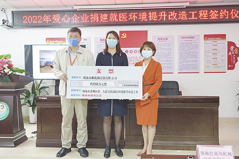 【記者陳藝珠海報道】昨日上午,珠海市香洲區第二人民醫院就醫環境提升改造工程簽約儀式在該院正式舉行。該項工程由愛心企業珠海永順機械設備有限公司捐贈善款九十六萬元、珠海仕高瑪機械設備有限公司捐贈善款九十萬元,對珠海市香洲區第二人民醫院住院部大樓六十二間病房進行裝修改造。