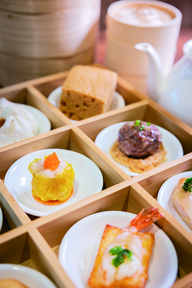 自選點心午市套餐只需澳門幣一百八十八元可任選五款精美點心,選單多達二十款集鹹、甜、蒸、炸的特色點心,其中「臘味糯米包」、「碧影芛尖蝦餃皇」及「蟹子冬菇燒賣皇」等為餐廳招牌點心。