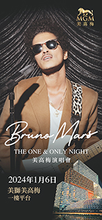 繼「火星人」Bruno Mars(布魯諾.馬爾斯)在拉斯維加斯美高梅大酒店杜比現場表演劇場的演出火爆售罄之後, 這位屢獲殊榮的國際巨星即將登陸美高梅國際集團位於澳門的合作夥伴酒店──美獅美高梅。作為享譽全球的亞洲旅行目的地,澳門在文旅發展和海外營銷方面成績斐然。與此同時,娛樂演出也是澳門吸引國際遊客的關鍵因素之一。長期以來,美高梅不僅憑藉多領域的非博彩投資引領業界,更持續致力於將無與倫比的演出陣容引入澳門,為本地居民和全球遊客帶來震撼體驗,以此不斷提升澳門作為大型活動目的地的國際聲譽。2024年1月6日,只此一晚的特別限定── Bruno Mars 「The One & Only Night」澳門演唱會將於美獅美高梅一樓平台熱力開唱。屆時,「火星人」將成為2024年首位登陸美高梅的國際巨星,為澳門本地以及環球遊客奉上驚喜新年大禮。Bruno Mars美高梅唱會門票將於2023年12月9日公開發售,更多票務信息,還請持續關注www.mgm.mo。