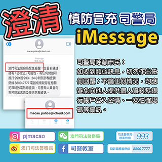 【特訊】昨日司警局接獲市民查詢,指其在接到假冒內地公安之詐騙電話後,隨即收到一個由「澳門司法警察局」發出提醒收件者提防電話詐騙之手機短訊(iMessage),而上述短訊之寄件者為「macau.police@icloud.com」。
