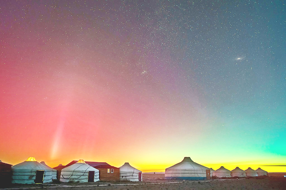 五月十一日的凌晨我在蒙古國的南戈壁拍攝星空!有幸遇上二十年一遇的磁暴,在北緯四十四度的夜空中欣賞了一場北極光秀,在這不特別高的緯度可以看到北極光簡直就是奇蹟一般,也可證明今次太陽物質的粒子和大氣層的碰撞有多強烈。我們肉眼已可看到一些變幻的光柱,而拍攝出來那一層洋紅色更是佔據了北面幾乎整個夜空。照片中也可看見M31仙女座大星系和仙后座雙星團,那一夜真是一次難忘的體驗啊!