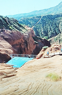 波浪谷景區內分為三個遊覽區,分別是火焰丹霞、赤壁丹霞及地心丹霞,它們基本上是匯聚了龍州丹霞景點的精華。火焰丹霞是最早發現龍州丹霞地貌的地方,那裡紅砂岩的顏色異常鮮艷,遠看有若火焰山;赤壁丹霞是典型的峽谷景觀,峽谷的北側的紅岩絕壁,高度幾近百米,南側是典型的黃土高原地貌山坡,谷底還有幾處天然的回音壁;至於地心丹霞,則是由上而下直至地心,多為峽谷和經受風蝕或水蝕縱橫交錯的溝壑所組成,而著名的一線天就在這個區域之內,遊人可以從木製步行棧道,順序走完全程5.8公里,大概需要3-4小時,亦可以選擇乘坐扶手電梯,但卻缺少了親身感受的過程了。◇(待續)