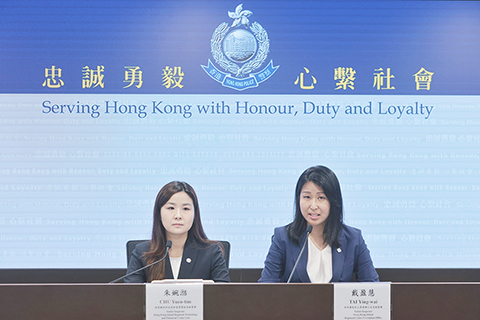 ◎ 十一月九日,香港警方港島總區刑事部舉行記者會。警方港島總區於今年十月廿八日至十一月八日,展開為期十二日的反詐騙及洗黑錢的「穿雲」行動。行動中,警方以「以欺騙手段取得財產」、「串謀詐騙」、「洗黑錢」及「煽惑他人犯洗黑錢」等罪拘捕一百廿六人,年齡介乎十四歲至七十八歲。圖為港島總區科技及財富罪案組高級督察朱婉湉(左)及港島總區防止罪案辦公室高級督察戴盈慧(右)出席記者會。(香港中通社記者謝光磊 攝)