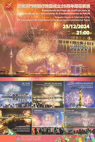 【特訊】今年為中華人民共和國成立75周年及澳門回歸祖國25周年,旅遊局將於12月25日晚上9時,在澳門旅遊塔對出海面舉行「慶祝澳門特別行政區成立25周年煙花表演」,向國家和澳門特區致以美好的祝願,為居民和旅客送上喜悅及祝福。煙花表演疊加「2024幻彩耀濠江」,加上煙花在聖誕假期燃放,全城將洋溢節慶熱鬧氣氛,展現澳門「旅遊+盛事」魅力。