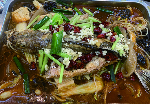 首本名菜香辣烤魚選用約一點六斤重新鮮的海鱸魚,烤好的海鱸魚與配菜以煤氣爐奉上,保持熱力之餘,皮脆肉嫩、香辣過癮,適合三五知己聚餐。
