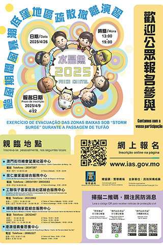 【特訊】為持續強化本澳防災減災的應急聯動效能,提升公眾對自然災害的防範意識,民防架構將於四月二十六日(星期六)舉行代號「水晶魚2025」民防演習。屆時,將模擬執行「颱風期間風暴潮低窪地區疏散撤離專項應變計劃」,並邀請市民共同參與實地演練,以加深市民對疏散撤離流程和路線的認識,強化協作精神。歡迎市民積極參與。
