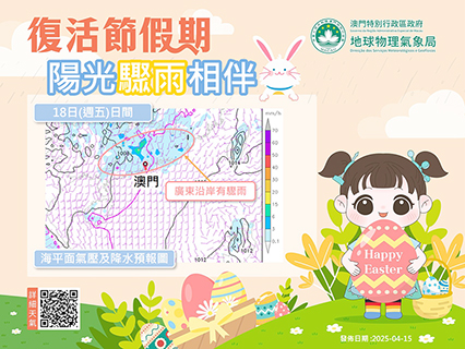 預料一道低壓槽將於本周後期影響廣東沿岸,復活節假期本澳雲量及驟雨將會增多,早晚較潮濕有薄霧。