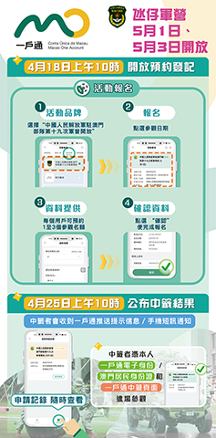 5月1日、3日參觀名額各2200個,每名「一戶通」用戶可以預約1至3個參觀名額。登記過程簡易便捷,用戶登入「一戶通」後,於「服務」中點擊「活動報名」,進入「活動品牌」頁面後,選擇「中國人民解放軍駐澳門部隊第十九次軍營開放」,選擇參觀日期並填妥相關信息,即完成預約登記。