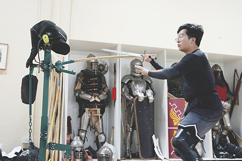 佘予然,圈內人稱「阿梟」,出生於四川,現居上海。大學時接觸到歐洲歷史武術(HEMA)的他從德國古典劍術體系入手,對歷史兵器與技法的研究逐漸深入。二0一五年,佘予然與伙伴共同創立上海歷史武術俱樂部(SHMA),將歐洲歷史武術、中國武術等項目納入系統訓練。如今,SHMA擁有二百多名會員,其中一半以上學習德國劍術,課程涵蓋歐洲長劍、軍刀、劍盾等。