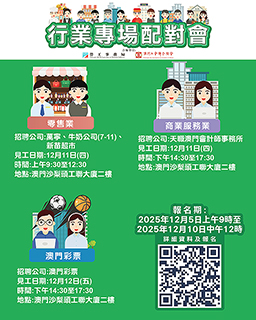 12月11日上午零售業專場配對會、12月11日下午「天職澳門會計師事務所」專場配對會及12月12日下午「澳門彩票有限公司」專場配對會,均在澳門沙梨頭海邊街2-6號工聯大廈二樓舉行。報名日期均由今(5)日上午9時起至12月10日中午12時。