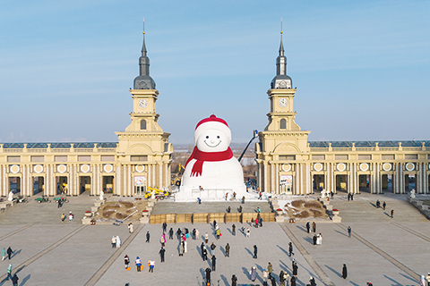 ◎ 十二月十五日,在黑龍江省哈爾濱市道里區群力音樂公園,「網紅大雪人」主體完工,驚豔亮相。大雪人戴著紅帽子、系著紅圍脖,用憨態可掬的微笑迎接八方來客。今年回歸的大雪人再次升級,身高達十九米,比往年「長高」一米,總用雪量超過三千立方米,比往年增加一千二百立方米,達到歷年之最。圖為大雪人吸引遊客打卡。(無人機照片)(中新社記者 趙宇航 攝)
