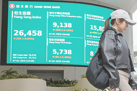 【香港中通社1月7日電】(記者梁嘉軒)港股7日結束3天升勢回吐,恆指一度跌近400點,全日收26458點,跌251點或0.9%。