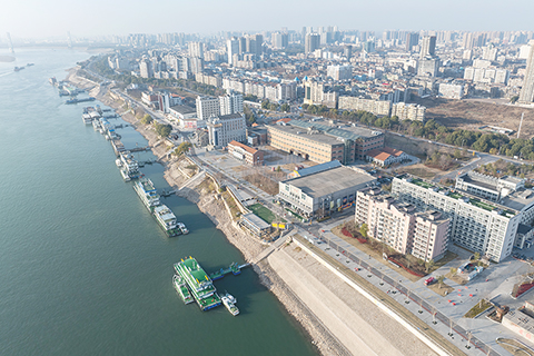 ◎ 這是一月七日拍攝的位於長江邊的湖北省荊州市沙市洋碼頭文創園(無人機照片)。近年來,湖北省荊州市持續推動歷史文化街區修復改造,以綠色發展為主導,依託沙市碼頭的悠久歷史和工業文化,打造集文化展示、濱江觀光、運動健身、雙創空間等多種業態為一體的沙市洋碼頭文創園。昔日碼頭、廠房變身城市新地標,成為人們休閒娛樂的好去處。(新華社記者 杜子璇 攝)