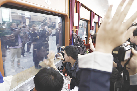 ◎ 一月十二日,旅客在Z99次列車餐車內,與站台上的工作人員揮手告別。當日十七時十九分,最後一班Z99次列車緩緩駛離鐵路上海站,駛向廣州白雲站。這趟經典的直達特快列車,將完成作為「綠皮車」的歷史使命。根據安排,全國鐵路將於一月二十六日零時起實施新的列車運行圖。運行近廿九年的滬穗間Z99/100次直達特快列車將正式升級為動車組列車運行。Z99次列車的前身是一九九七年五月十九日開通的滬港直通車K99次列車,該列車最初運行於上海與香港九龍站之間,全程運行時間約廿九小時。(中新社記者 殷立勤 攝)