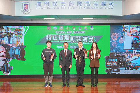 【特訊】1月14日,由澳門保安部隊及保安部門合辦、澳門保安部隊高等學校(下稱「保安高校」)承辦的「持正奮進執法為民」中文徵文、攝影及短視頻比賽,在保安高校舉行頒獎禮。保安司司長陳子勁擔任主禮嘉賓,並邀請中聯辦警務聯絡部部長王前進、警察總局局長梁文昌、澳門海關關長何浩瀚、校董會成員、保安部隊及保安部門各領導、學術及教學委員會成員、賽事評委、各組別的得獎者,以及高等院校和中學代表等約180人出席,共同觀賞各位得獎者的精彩作品和見證榮耀時刻。