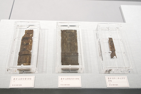 封檢相當於古代的「信封」,用於公文傳遞時捆扎並加封泥,以保障文書安全。現場展示的三枚封檢上分別寫有「山陰守褒」與「山陰吏馬行」「河平二年七月盡」。