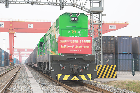 ◎ 二月二十五日,陝西西安,X387次「絲路電商」班列從西安國際港站駛出,一路向西開往烏魯木齊。同時,X8588次「雪蓮速運」班列滿載電商快遞貨物從烏魯木齊三坪站相向啟程。這標誌著西安至烏魯木齊間雙向電商班列累計開行突破一千列大關,為助力降低全社會物流成本,打造入疆快速貨運通道提供了充足的運能保障。圖為X387次班列整裝待發。(中新社發 楊玥攝)