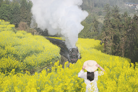 四川犍為:「開往春天」的小火車醉遊人 2026-03-05 03:30:00 ◎ 三月四日,四川省樂山市犍為縣,被譽為「開往春天」的嘉陽蒸汽小火車穿行在鐵路沿線的油菜花海間,與盛放的油菜花構成一幅靈動的春日畫卷。圖為一名女遊客在油菜花間小道上眺望緩緩駛來的蒸汽小火車。(中新社記者 劉忠俊 攝)