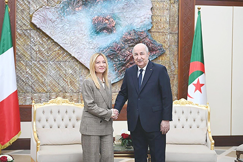 ◎ 意大利總理梅洛尼3月25日在訪問阿爾及利亞期間表示,兩國同意通過加強海上勘探等項目合作,增加阿爾及利亞向意大利的天然氣供應。圖為當日,在阿爾及利亞首都阿爾及爾,阿爾及利亞總統特本(右)會見來訪的意大利總理梅洛尼。(新華社發 阿爾及利亞總統府供圖)