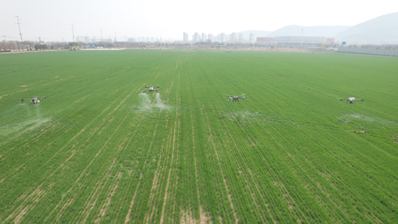 麥田上空,多台智能植保無人機來回穿梭。孟迪告訴中新社記者,過去人工撒肥,一天十幾畝,人累得直不起腰。「現在我一個人操作無人機,一天幾百畝輕輕鬆松。這有利於精準抓住降雨前追肥窗口期,守護小麥穩產增收。」