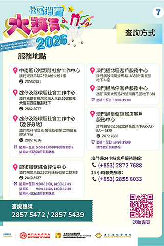 活動將於4月10日正式啟動,經科局冀在商會、社團和居民的積極配合和參與下,為本澳消費市場注入活力,盤活社區經濟,推動經濟適度多元發展。市民如欲了解更多活動詳情,可瀏覽「2026社區消費大獎賞」活動專頁(https://www.macaospendingrewards.com/)或致電熱線電話(28575472或28575439)查詢。◇