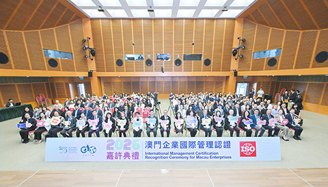 【特訊】澳門生產力暨科技轉移中心(下稱「生產力中心」)於本月二日假澳門科學館舉行「二0二六澳門企業國際管理認證嘉許典禮」,表彰共一百三十四家持續持有國際認證的本澳企業。典禮依企業連續持證年資頒發金獎、銀獎及銅獎,並特別增設「綜合管理成就獎」,以嘉許模範企業。